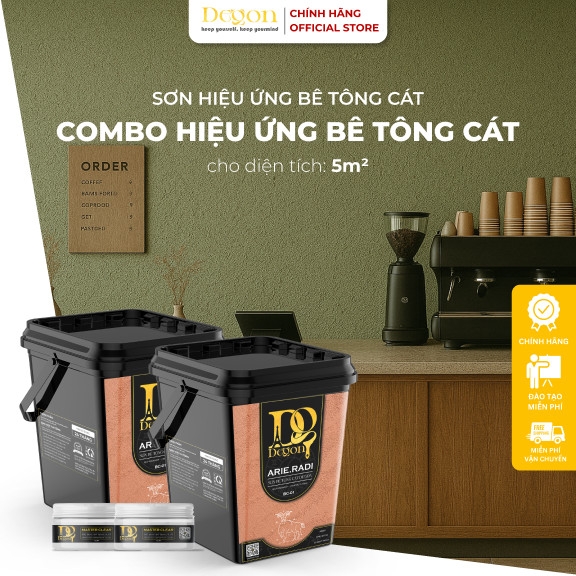 Combo 5m2 sơn hiệu ứng bê tông cát Lỗi giao diện: file 'snippets/shortcode-Định.bwt' không được tìm thấy |HIỆU ỨNG DE'GON Gồm: + Sơn BTC: 2x4.5kg + Clear bóng mờ: 2x250g Quà tặng: 01 lu chỉ + 01 miếng gạt nhựa + mút xốp + 01 cuộn băng dính che sơn + 01 màng nilong che sơn (55cm*20cm) - Định mức: 4-5m2 - Số lớp hoàn thiện: 2 lớp - Thành phần: Nhựa gốc Acrylic, bột khoáng, chất bền màu không chứa chì và thủy ngân, phụ gia khác - Ưu điểm: Sơn hiệu ứng Bê tông cát mang đến vẻ đẹp mạnh mẽ, tối giản nhưng vẫn đầy tinh tế và nghệ thuật, phù hợp với những không gian theo đuổi phong cách hiện đại, công nghiệp (Industrial), Wabi-Sabi hay Minimalism. Đây là lựa chọn hoàn hảo cho những ai yêu thích sự thô mộc, chân thực nhưng vẫn sang trọng và cá tính. - Ứng dụng: Ứng dụng phù hợp với nhiều không gian ✔ Phòng khách – Phòng ngủ – Tạo cảm giác hiện đại, tinh tế nhưng vẫn ấm cúng. ✔ Quán cà phê – Nhà hàng – Bar – Lounge – Phù hợp với không gian Industrial, Rustic, Vintage, giúp không gian có chiều sâu và cá tính hơn. ✔ Showroom – Studio – Văn phòng sáng tạo – Mang lại sự độc đáo, khác biệt và đầy cảm hứng sáng tạo. ✔ Khách sạn – Resort – Homestay – Tạo điểm nhấn tự nhiên, thư giãn nhưng vẫn sang trọng. ✔ Công trình kiến trúc hiện đại – Ứng dụng cho tường, trần, sảnh, hành lang, mặt tiền để tăng tính nghệ thuật và sang trọng. - Bề mặt hoàn thiện giống cát tự nhiên. - Điều kiện thi công: Thi công trên bề mặt tường đã trát và ít nhất 1 lớp lót. Trường hợp tường sơn, bả cũ cần phải quét 1 lớp sơn lót để tạo chân bám và tăng kết nối - Quy trình thi công: +B1: Làm sạch bề mặt thi công và tạo vân nhẹ với lớp nền mỏng phủ hết bề mặt (Khô sau 30-60 phút) +B2: Làm lớp 2, tạo vân để tạo hiệu ứng theo ý muốn. (Khô sau 1-2h) +B3(nếu cần): Lớp 3 tạo thêm vân ở những điểm chưa vừa ý, quét dặm thêm cho đẹp mắt. (Khô sau 1-2h) +B4: Phủ một lớp sơn bóng mờ (clear) để giữ cho màu sơn đẹp, bền, dễ vệ sinh. - Lưu ý: Sau khi hoàn thành mỗi lớp đều phải để khô rồi mới thi công lớp tiếp theo. Lăn clear phải lăn đều và hết để tránh để lại vết. Có thể thi công thêm lớp để tạo hiệu ứng nhiều hơn